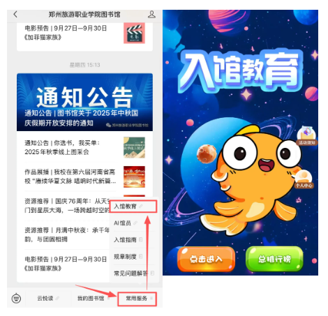 1.关注太阳成集团tyc7111cc微信公众号(扫描下方二维码),选择“常用服务”,点击“新生入馆教育”。即可跳转至统一身份认证平台登录界面,使用统一身份认证账号密码登录。找到首页“入馆教育”应用,完善个人信息后即可进入活动。