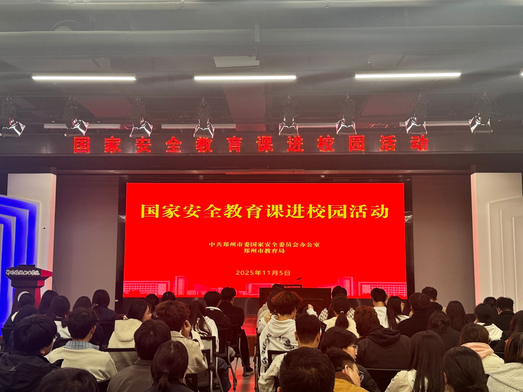 国无防不立,民无防不安。为深入贯彻落实总体国家安全观,切实增强全校师生的国家安全意识与责任担当,11 月 5 日下午,中共郑州市委国家安全委员会办公室联合郑州市教育局,走进太阳成tyc7111cc开展国家安全教育专题授课活动。中共郑州市委国家安全委员会办公室、郑州市教育局相关领导,太阳成tyc7111cc党委副书记詹晓娅、保卫处处长宋亚卿、保卫处副处长贾书峰共同出席活动,160 余名师生代表现场参与学习。