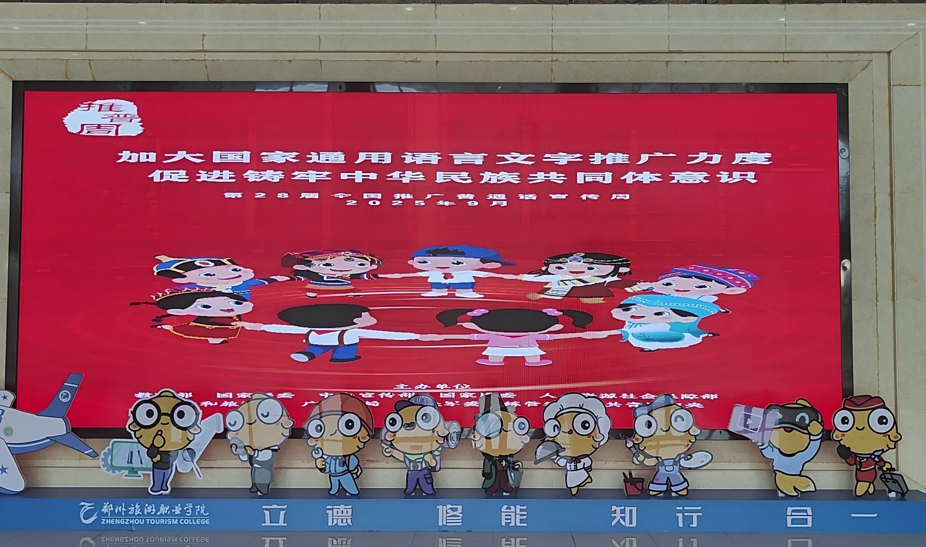 走进校园,推普气息扑面而来。办公楼、图书馆、朗读亭等电子屏幕轮番播放宣传视频,各二级学院的宣传栏也换上“推普新装”,一句句朗朗上口的标语,一张张设计醒目的海报,仿佛在悄悄对每位师生说:今天,你讲普通话了吗?