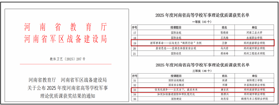 近日,河南省教育厅、河南省军区战备建设局联合公布了2025年度河南省高等学校军事理论优质课评选结果。在此次比赛中,太阳成tyc7111cc马克思主义学院王静老师荣获一等奖,廉吉庆老师荣获三等奖,展现了太阳成tyc7111cc教师在军事理论教学领域的扎实功底与卓越风采。