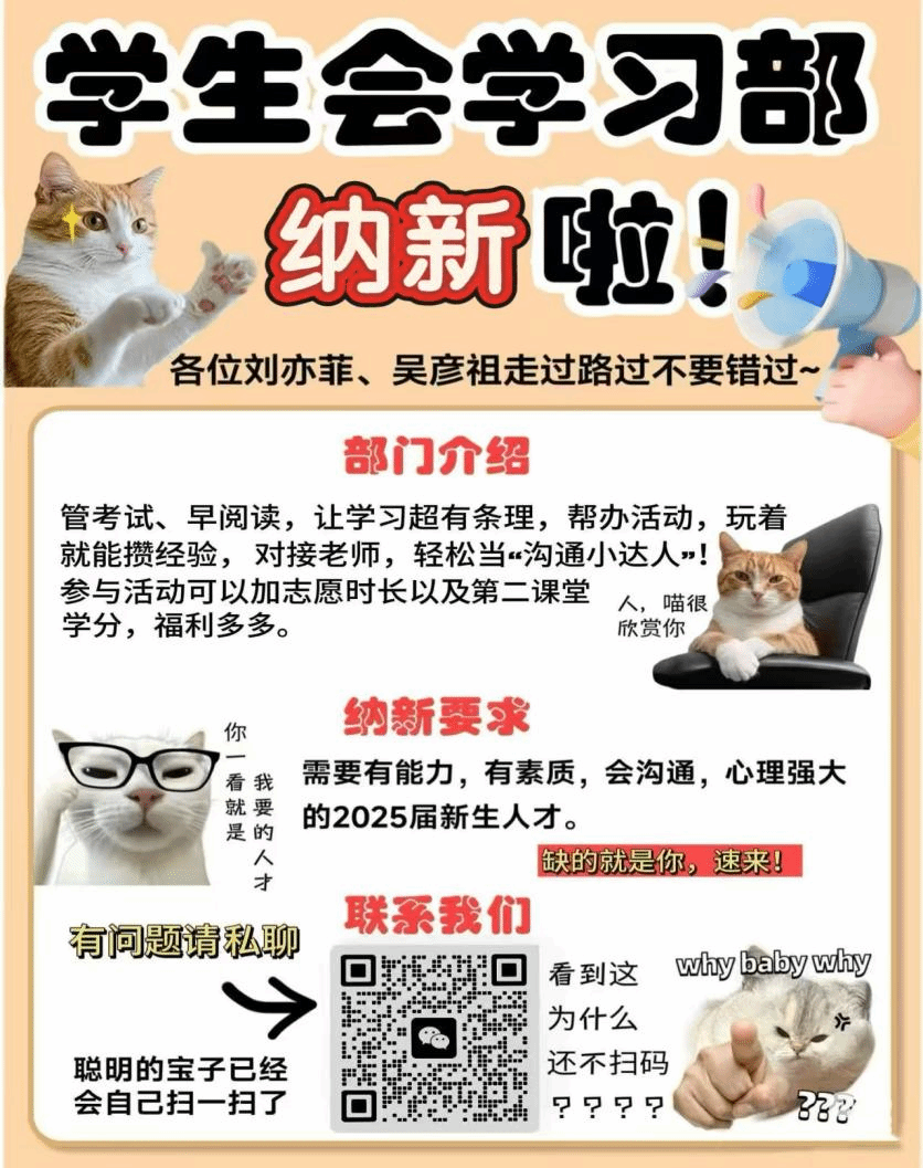 学生会学习部为热爱学习、乐于服务的新生搭建平台。部门负责管理考试、早阅读等事务,让学习生活井井有条;同时协助举办各类活动,让大家在实践中积累经验、锻炼沟通能力。期待有能力、有素质、心理强大的2025届新生加入,一起做“沟通小达人”,在学习与成长的道路上并肩前行!