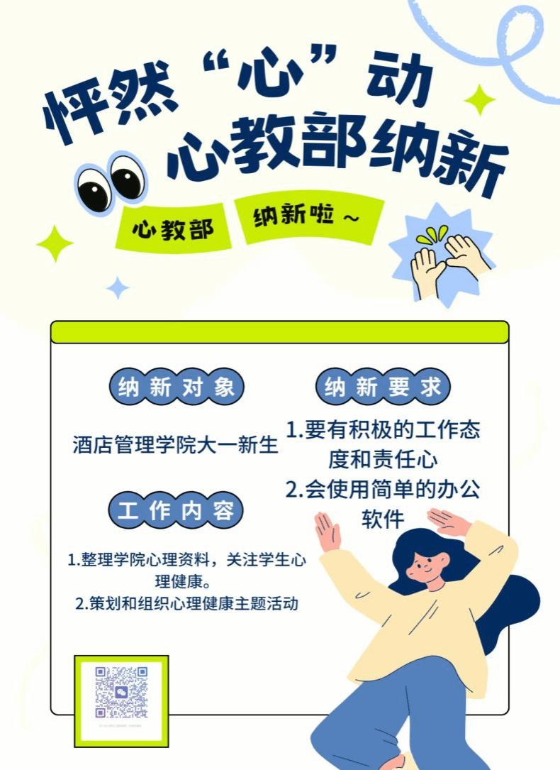 心教部面向酒店管理学院25级大一新生招新,以“整理学院心理资料,关注学生心理健康,策划和组织心理健康主题活动”为工作核心。只要你有积极的工作态度和责任心,会使用简单办公软件,就能加入这个温暖的团队,成为同学们心理健康的守护者,在策划心理活动、传递心理关怀的过程中,实现自我成长与价值传递!