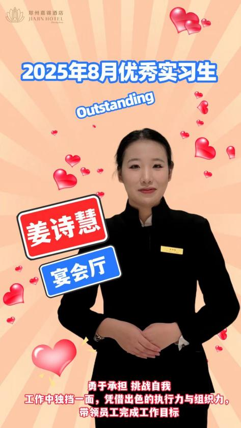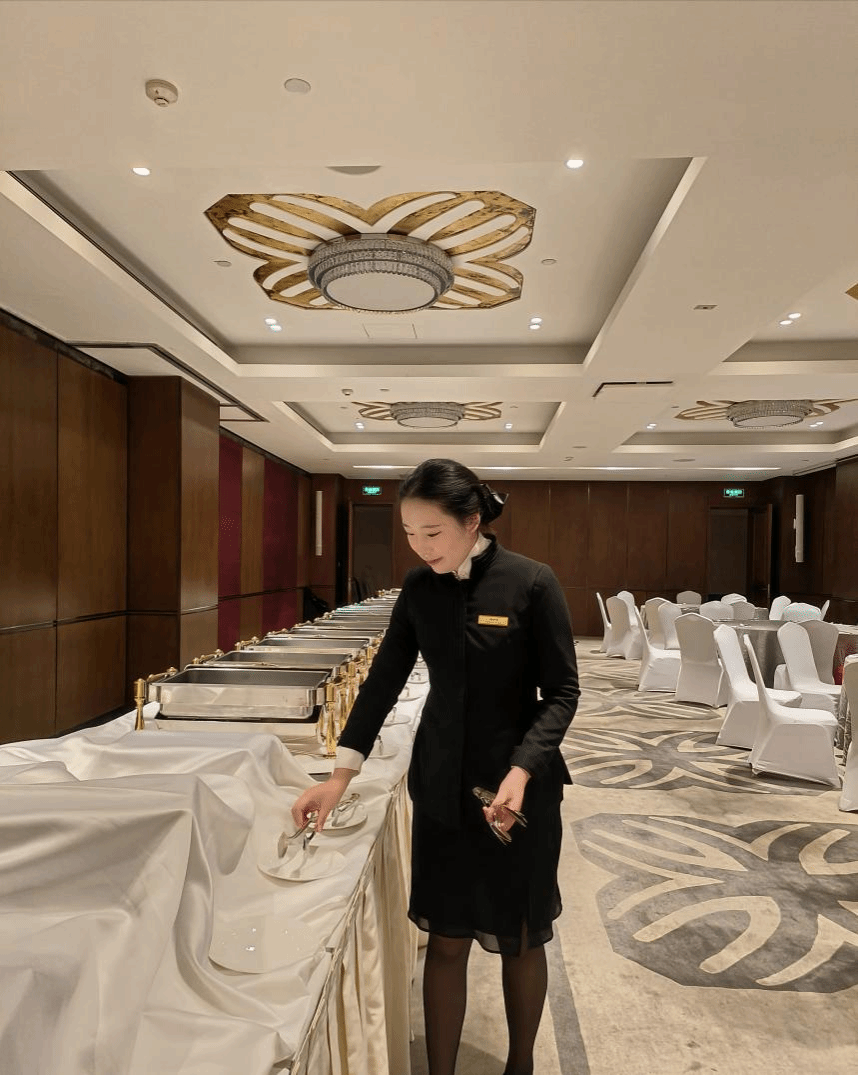 如今再看宴会厅,它不再是令人陌生的“战场”,而是我能从容把握节奏的“工作区”,可以独立带领其他部门同事完成摆台及会议、餐宴的全程保障工作。这三个月虽未学到深奥大道理,却实实在在地练就了“不慌”的本领——清楚何时该做什么,也能稳稳当当地做好每件事。同时,也锻炼了与其他部门同事相处、执行任务和组织协调的能力。