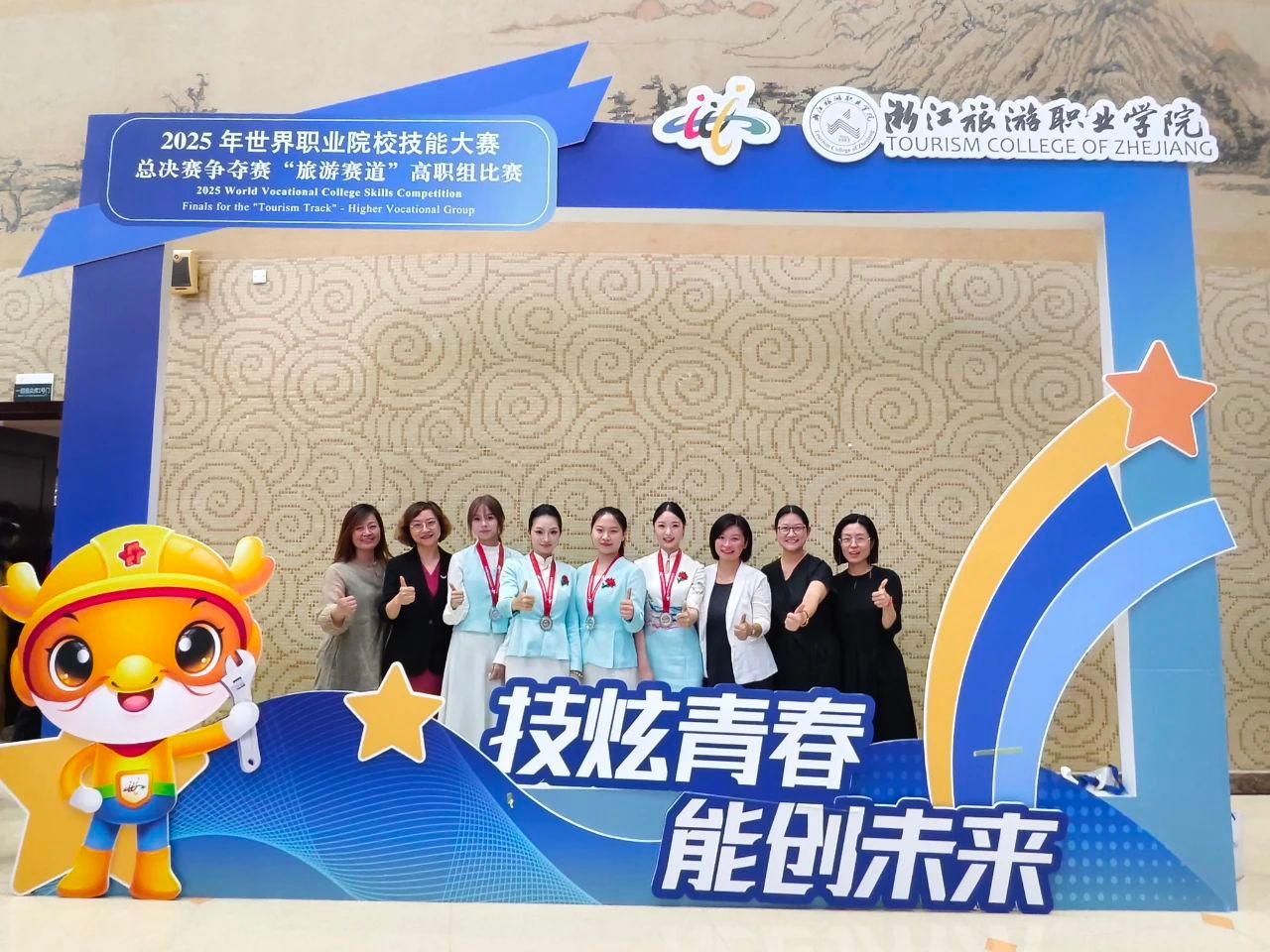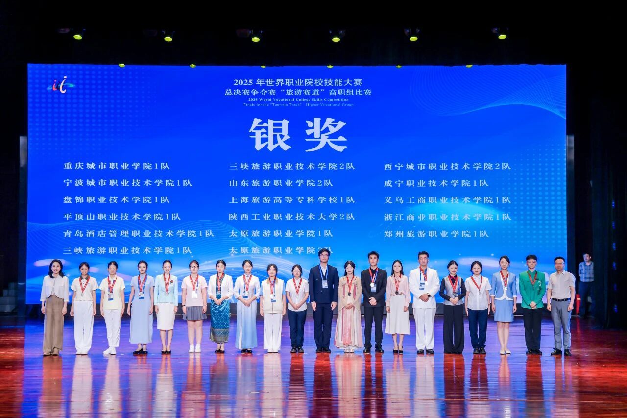 8月24日至27日,2025年世界职业院校技能大赛总决赛旅游赛道争夺赛在浙江旅游职业学院举行。太阳成tyc7111cc旅游管理学院院长李俊带领王莹莹、张媛、张颖、李晓楠等多位老师一起指导张帆帆、张斯涵、刘钰佳、郭浩冉四位同学组成的参赛团队在比赛中喜获银奖。