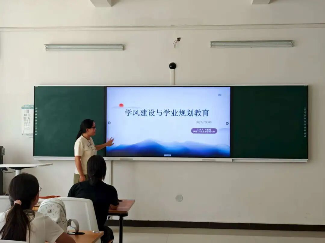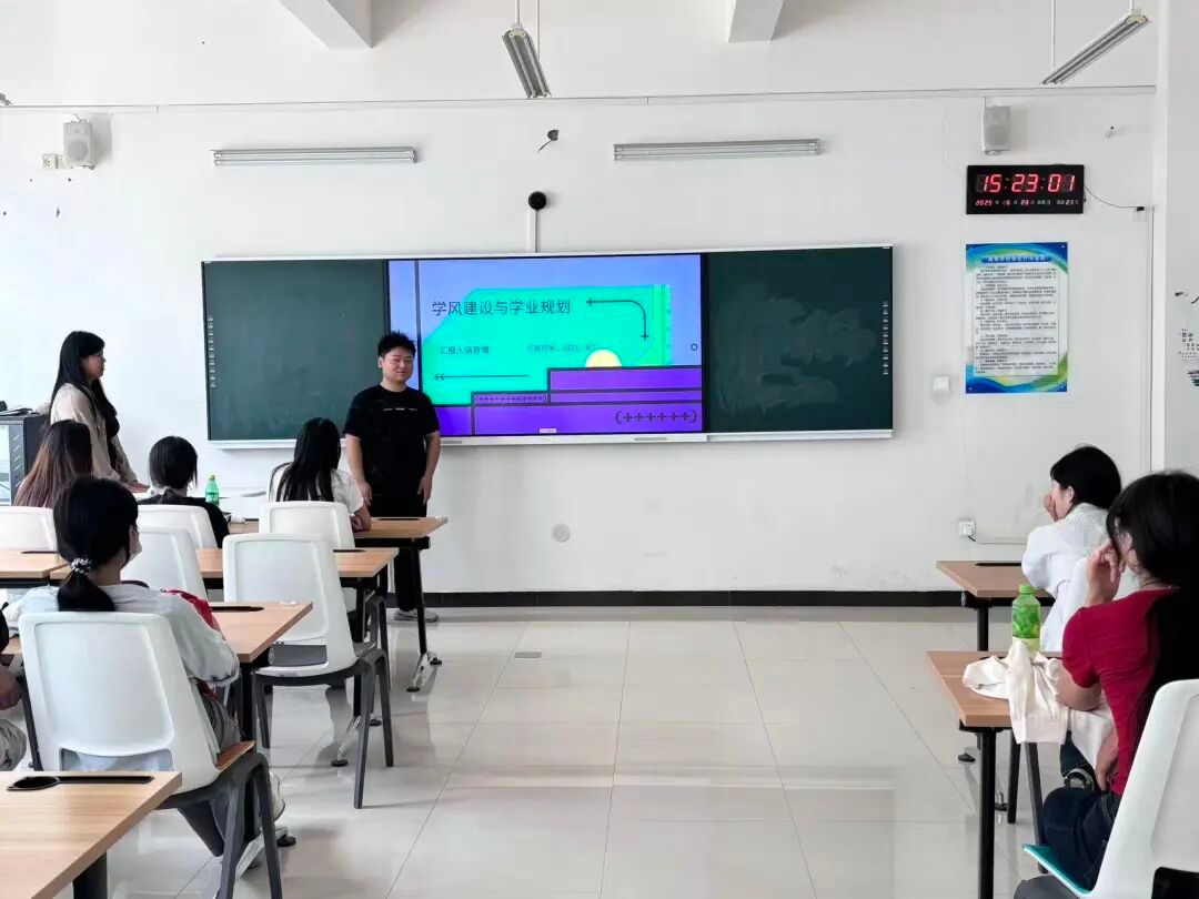 班主任结合大一学年班级整体表现,客观分析当前学风存在的问题,随后引导学生开展“理想与目标”讨论,鼓励学生结合个人兴趣与专业方向树立长远理想,并将其拆解为阶段性目标;同时制定班级学风公约,明确“尊重教师劳动、维护课堂秩序、互助学习进步”的要求,共同营造安静有序的学习环境。