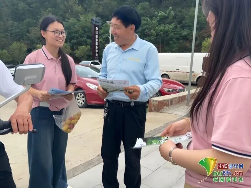 图为“筑梦旅成·青春力行”社会实践队在登封摘星楼风景区向游客宣传文明旅游。付玉佳 供图