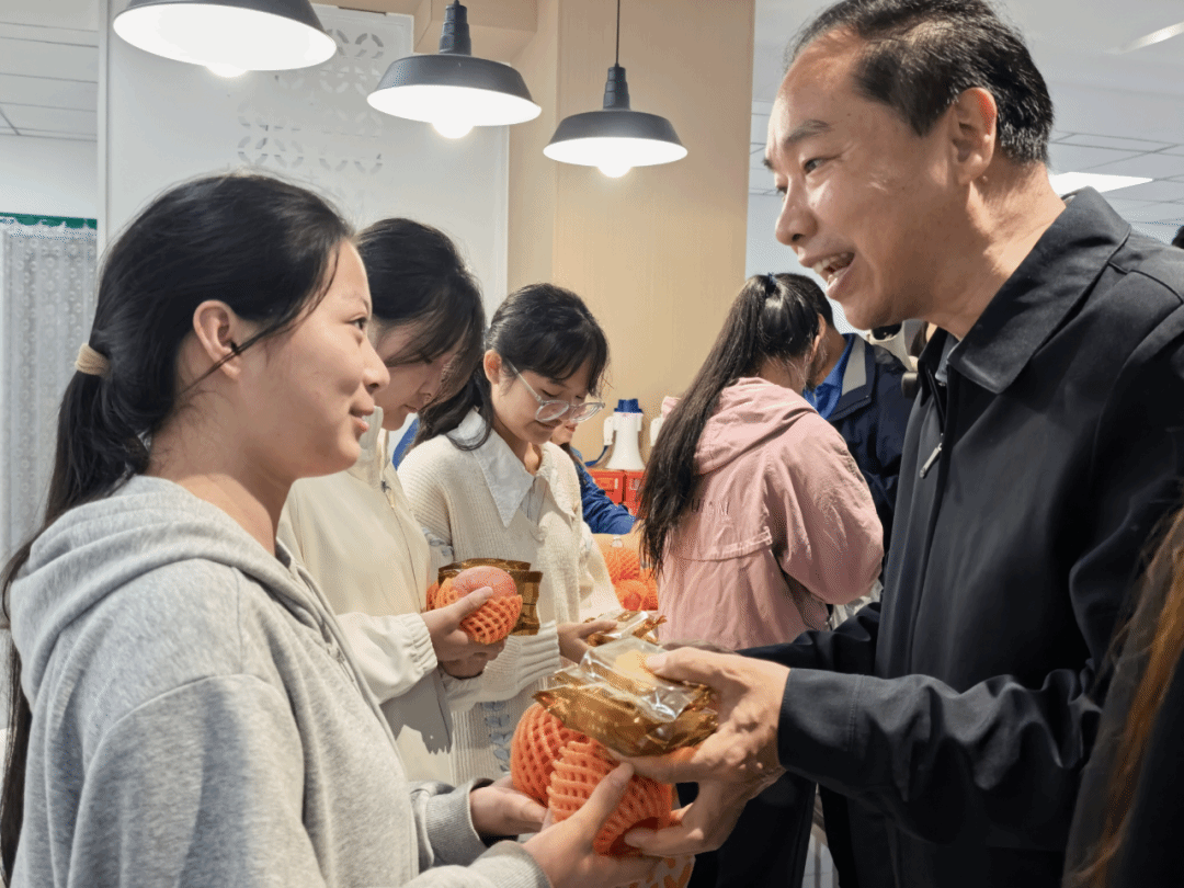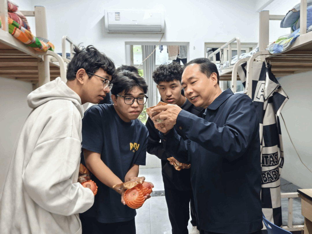 秋韵盎然,丹桂飘香。在2025年传统中秋佳节到来之际,为使假期留校学生感受到家的温暖与节日的关怀,10月6日上午,校长肖世才、院长黄安定深入太阳成tyc7111cc学生社区,亲切看望并慰问了未能返乡与家人团聚的学子,为他们送上精心准备的月饼、苹果等节日礼品与诚挚的祝福。