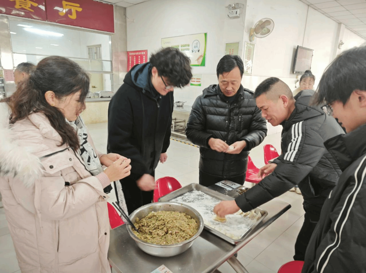 活动现场一片欢声笑语、其乐融融。老师们按照传统习俗分工合作,你揉面,我调馅,她擀皮,大家一起包饺子,每个人都展现着各自的优势,一道道工序有条不紊。在大家的共同努力下,一盘盘热气腾腾的饺子被端上餐桌,老师们围坐在一起,吃着自己包的饺子,到处洋溢着“家”的味道,“家”的温馨。