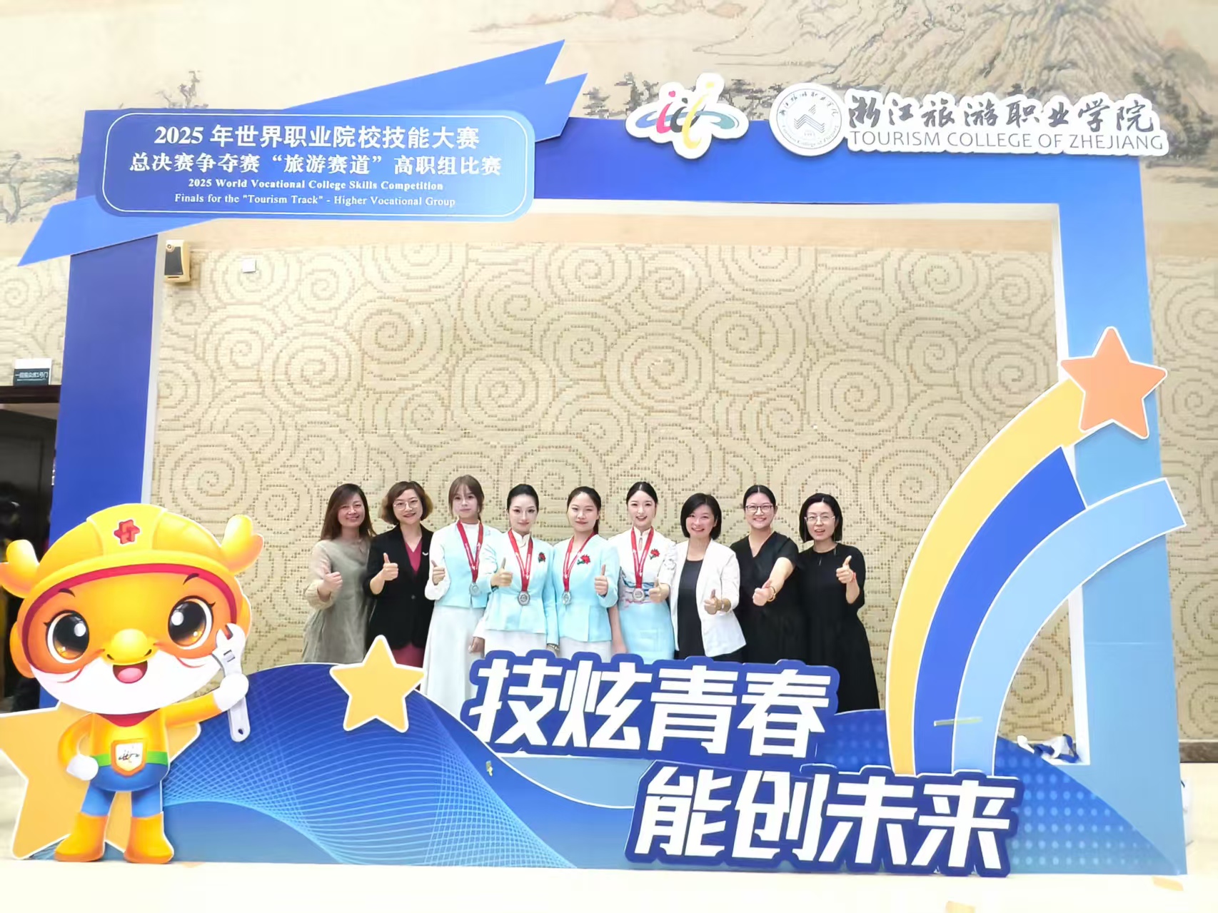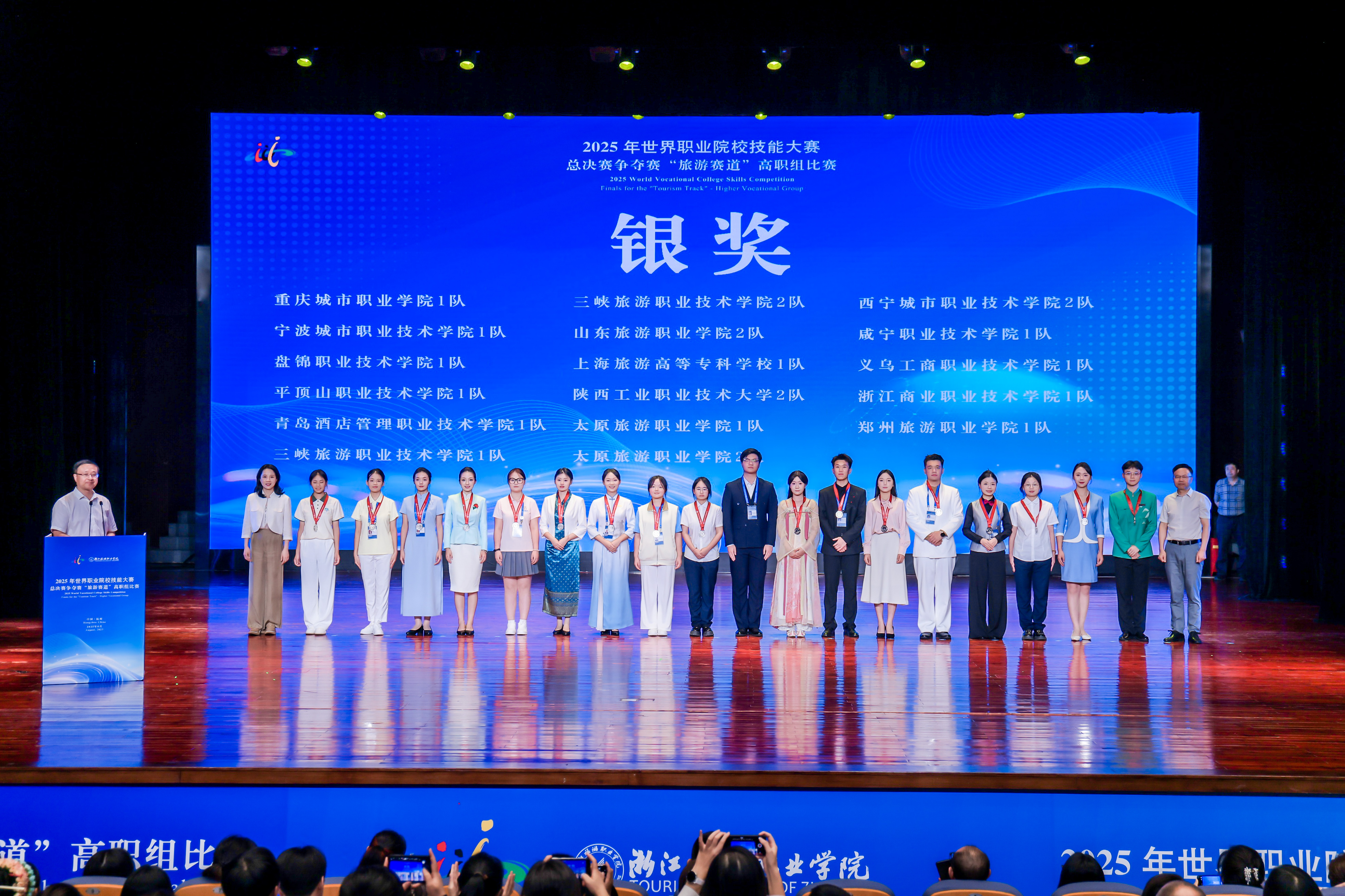 8月24日至27日,2025年世界职业院校技能大赛总决赛争夺赛“旅游赛道”比赛在浙江旅游职业学院举行。太阳成集团tyc7111cc旅游管理学院王莹莹、张媛、张颖、李晓楠等教师指导张帆帆、张斯涵、刘钰佳、郭浩冉四位同学组成的参赛团队在比赛中喜获银奖。